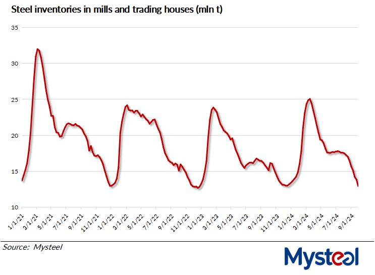 China's steel inventory levels have also dropped significantly this month. By September 26, the total stocks of major carbon steel products held by steelmakers and traders in 35 Chinese cities Mysteel checks had fallen by 2.7 million tonnes since late August to reach their lowest point since December 2022.