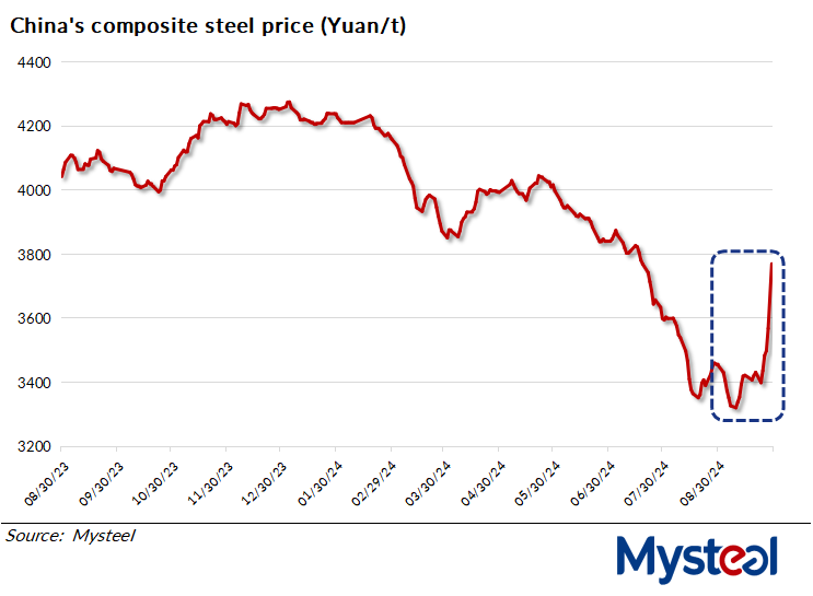 The steel market has rebounded as the end of September nears, with prices rising significantly. Mysteel has reported that by September 27, the national composite steel price had climbed by Yuan 114.8/tonne ($16.4/t) compared to August 30 and reached Yuan 3,567.9/t. This surge was largely driven by the central government's stimulus package introduced on September 24, which lifted market sentiment for all domestic ferrous commodities.