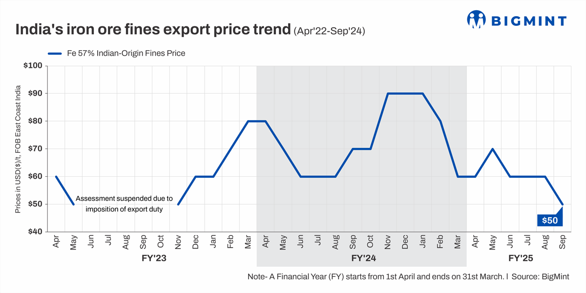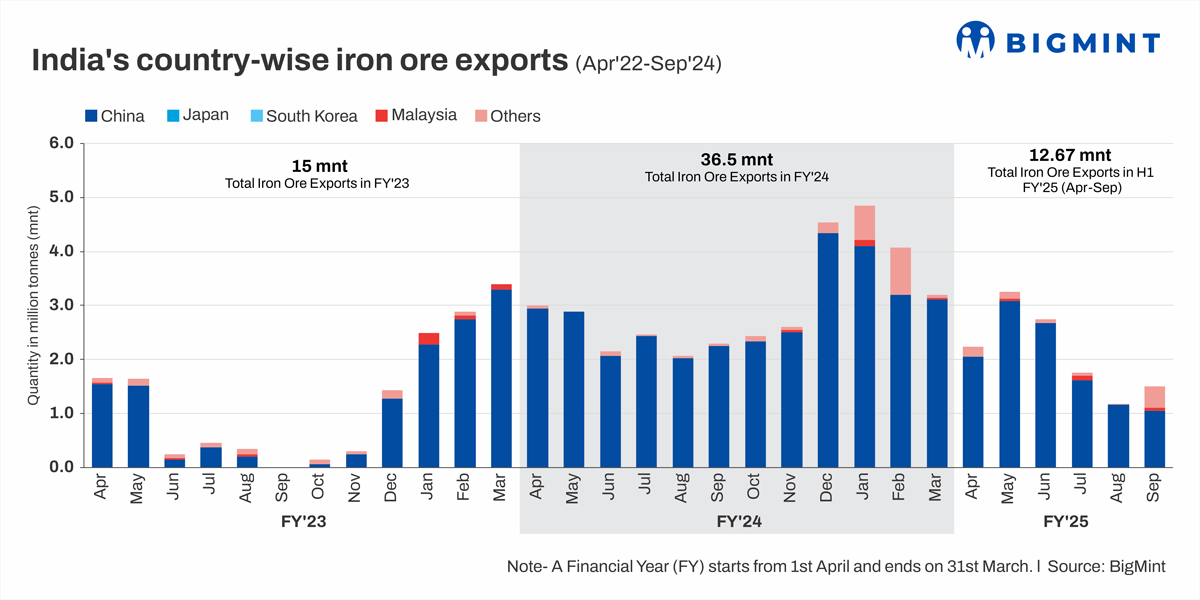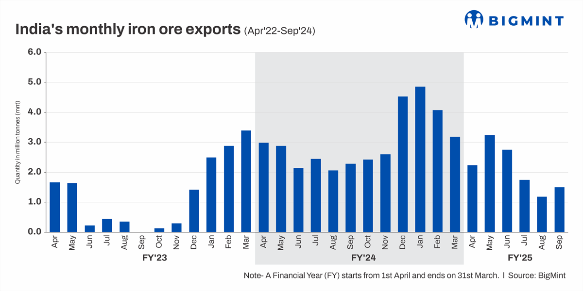 Morning Brief: India's iron ore exports, minus pellets, during the April-September 2024 (H1FY'25) period were approximately 12.68 million tonnes (mnt), as per data collated by BigMint. Iron ore exports declined nearly 15% y-o-y compared with 14.8 mnt in H1FY'24.