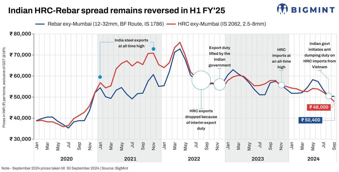 However, HRCs consistently remained priced lower m-o-m against rebar over April- July, then increased by a mere INR 300/t ($4/t) in August, only to decrease by a sharper INR 2,400/t ($29/t) in September. On an H1FY'25 basis, rebars were stronger at INR 54,000/t ($644/t) against HRC's INR 51,880/t ($618/t).