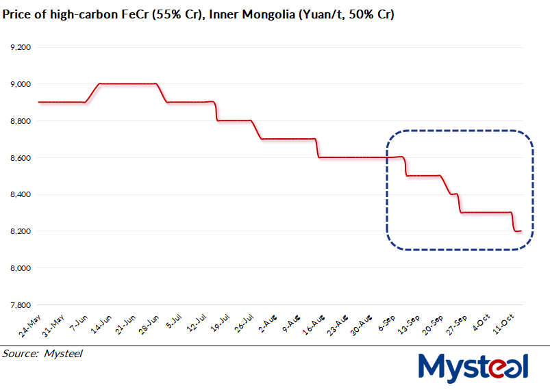 As of October 14, the price for high-carbon FeCr (with 55% Cr content) in North China's Inner Mongolia – a key benchmark for the domestic market – had dropped by Yuan 300/tonne ($42.20/t) compared to the previous month to settle at Yuan 8,200/t, a new low since December 2022, according to Mysteel's assessment.