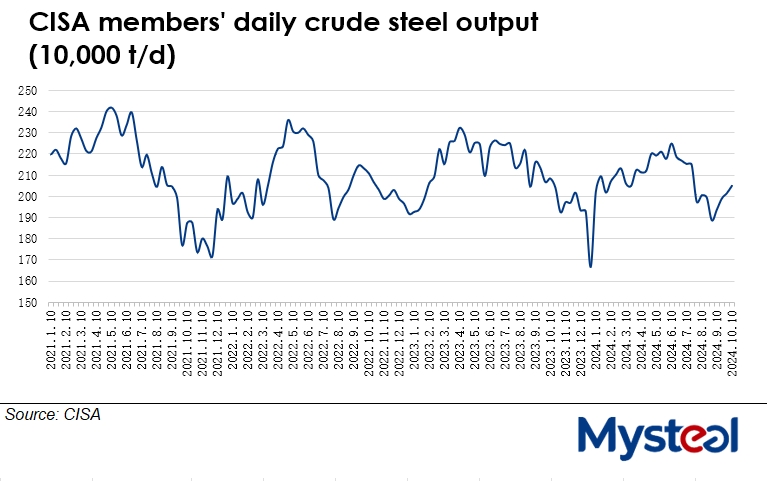 Daily crude steel output among the member mills of the China Iron and Steel Association (CISA) rose further during October 1-10, edging higher by 1.7% or 35,000 tonnes/day from late September to average 2.05 million t/d, according to the association's release on Thursday. Market sources attributed the rise in daily output to these mills ramping up production in a bid to capitalise on sustained profits.