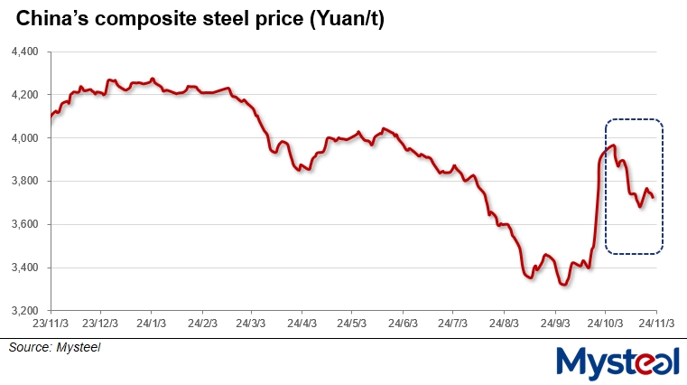 Steel prices in China briefly hovered at a seven-month high in early October before retreating rapidly amid cooled market sentiment, with the national composite steel price sitting at Yuan 3,631/tonne ($509.7/t) including the 13% VAT as of October 31, lower by a significant Yuan 313/t or 7.9% from the end of September, Mysteel's assessment shows.