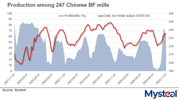 Mysteel's survey showed that by the end of last month, the daily production of hot metal among the 247 sampled blast furnace (BF) steelmakers nationwide had risen to 2.35 million tonnes/day, getting close to the highest level for this year.