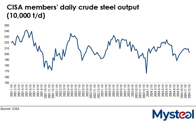 During December 1-10, daily crude steel production among the member mills of the China Iron and Steel Association (CISA) declined from the late November result, falling by 3.2% or 67,000 tonnes/day to average 2.02 million t/d, a two-month low, according to the association's release on December 14.