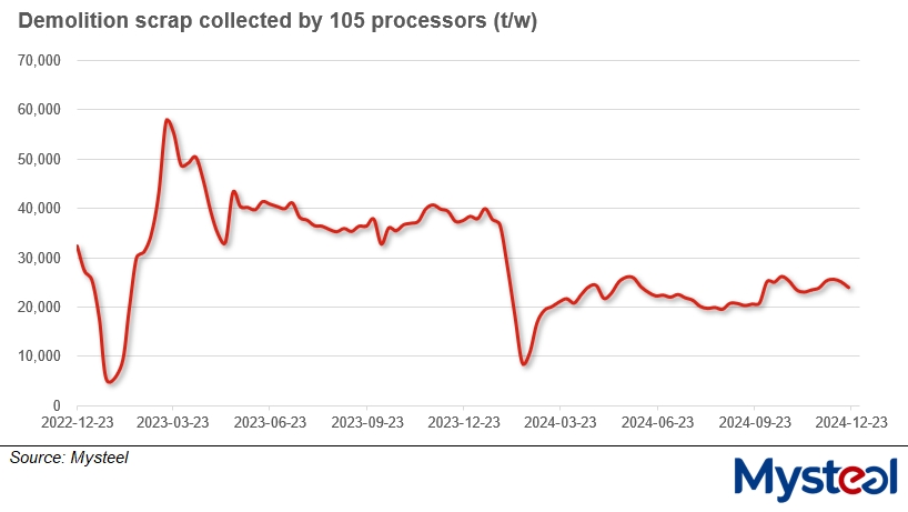 The slow progress being made in domestic building demolition projects was a main reason cited for the reduction in overall scrap supply this year, as reported. During January-November, the total volume of demolition steel scrap collected by the 105 steel scrap recycling companies nationwide under Mysteel's regular tracking averaged 23,258 tonnes/month, lower by a substantial 13,670 tonnes/month or 37% compared with the same period last year.