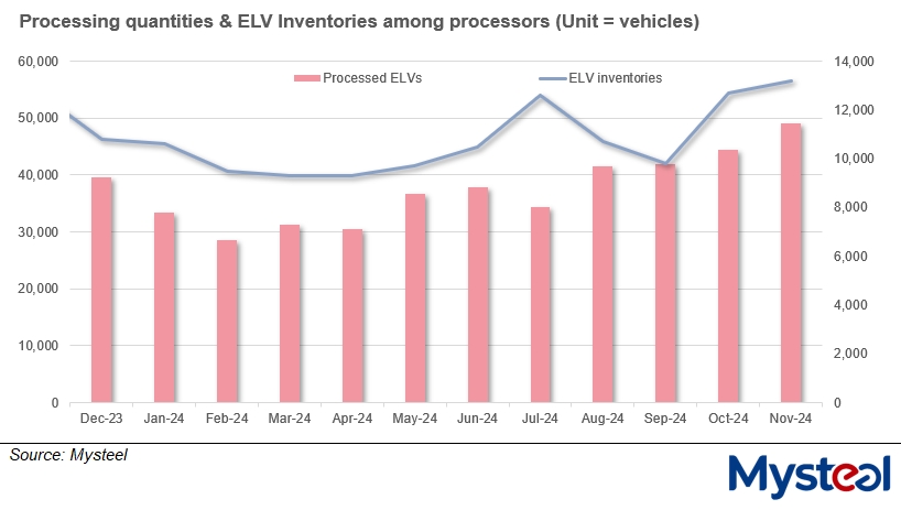 Ever since the "trade-in" policy for automobiles was introduced in late April this year, domestic steel scrap processors have seen a steady increase in the volume of end-of-life vehicles (ELVs) delivered to their yards, as Mysteel Global reported. In November, a total of 49,000 ELVs were scrapped and shredded by the 85 domestic automotive scrapping and dismantling companies under Mysteel's tracking, higher by 22.8% compared with the same period last year.