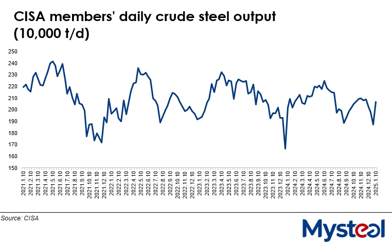 The member mills' daily output for early January reached an average of 2.07 million t/d, the CISA data showed, with their output rising by a large 10.3% or 193,000 tonnes/day from late December's average, as against the 5.3% fall during the prior period. The daily average was also 4.2% higher than the corresponding period last year.