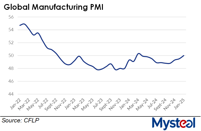 The global manufacturing Purchasing Managers' Index (PMI) increased for a third month in January to reach 50, up by another 0.5 point on month, according to the latest data compiled by the China Federation of Logistics & Purchasing (CFLP).
