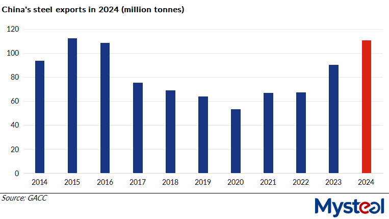 According to data from China's General Administration of Customs (GACC), the country exported 110.72 million tonnes of finished steel in 2024 -- the highest level in nine years and up 22.7% year on year, marking the fourth consecutive annual increase. This figure was second only to the record high in 2015.