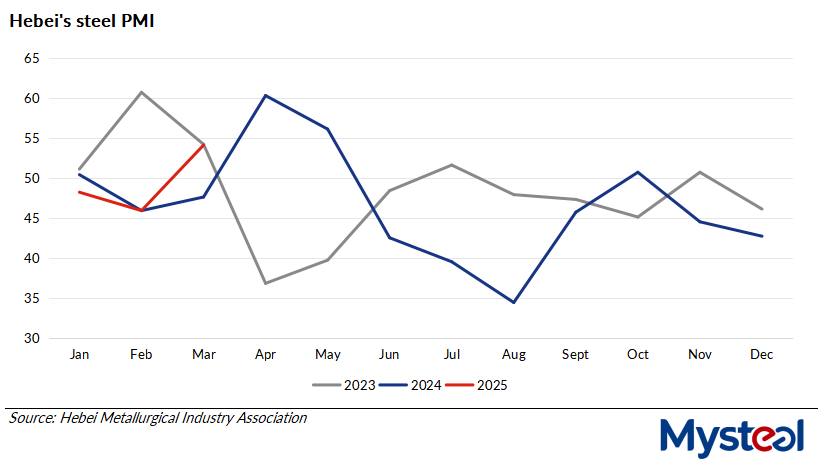 The Purchasing Managers' Index (PMI) for the steel industry in North China's Hebei province, the country's top steel production base, leapt by 8.2 percentage points on month to reach 54.1 in March, according to the Hebei Metallurgical Industry Association. Prior to this, the index had remained in the contraction zone below 50 for four consecutive months, Mysteel Global observed.