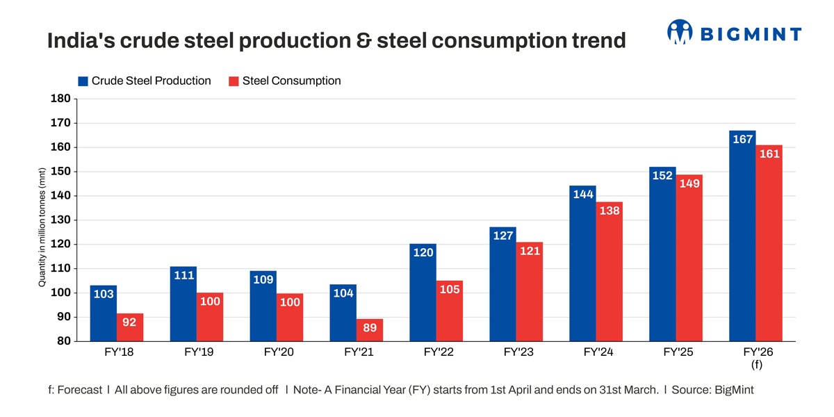 BigMint data show that combined capacity addition by the primary mills was around 13 mnt in FY'25 compared with the preceding fiscal. JSW, Tata Steel, JSPL and AM/NS India have ambitious expansion plans in the coming years. SAIL has announced an investment pipeline of over INR 100,000 crore to raise capacity to 35 mnt by 2030.