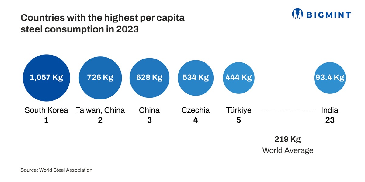 As per provisional data available with BigMint, India's steel consumption is expected to be around 149 mnt in FY'25. Per capita steel consumption in 2023, as per WSA data, was 93.4 kg, which is expected to have increased since then. However, the global average is around 220 kg, while consumption is far higher in the developed economies.