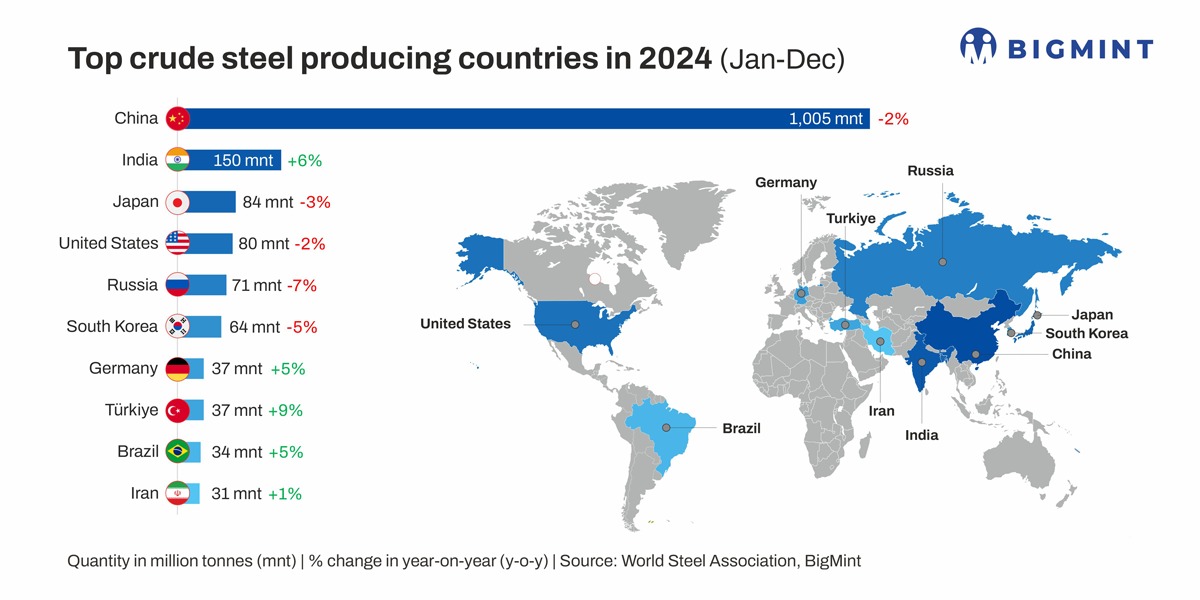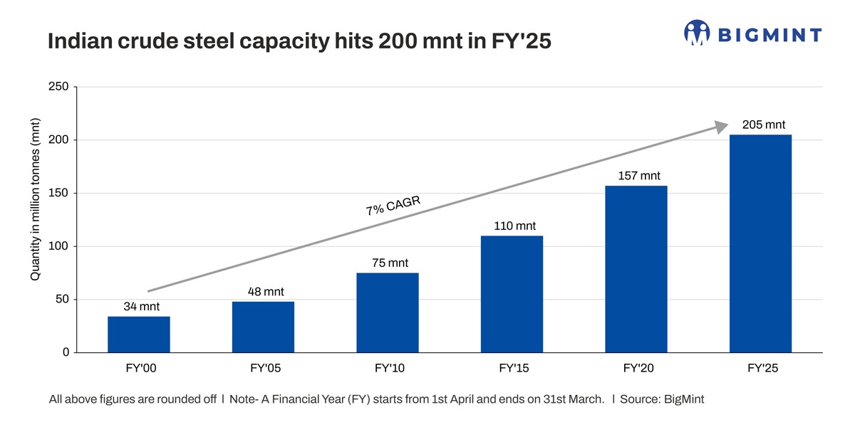 Morning Brief: India's crude steel production capacity increased by over 10% y-o-y in FY'25 to reach 205 million tonnes (mnt) as against 186 mnt in FY'24, according to provisional data maintained with BigMint. Capacity has almost doubled in the last 10 years from 109 mnt in FY'15.
