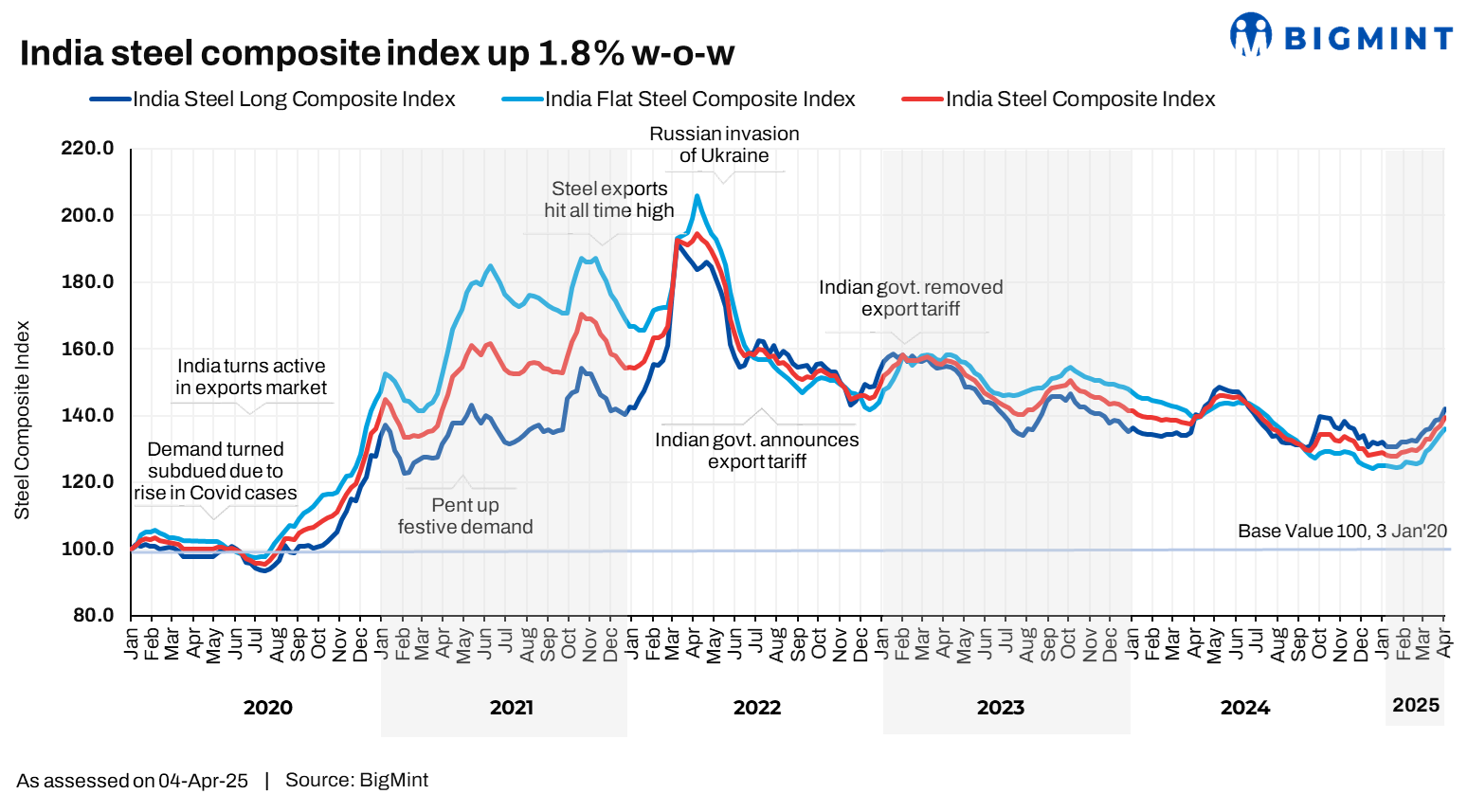 Morning Brief: BigMint's India Steel Composite Index, a barometer of the domestic market, continued to show steady improvement in the week ending 4 April, 2025. The index climbed by 1.8% w-o-w as steel prices kept trending up amid favourable market sentiments following the proposal of a safeguard duty implementation in mid-March.