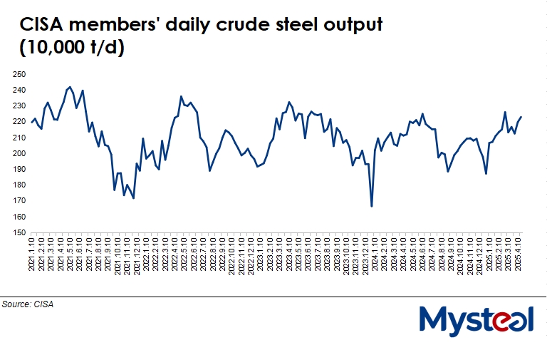 In addition, based on the performance of its member mills, CISA estimated that the country's daily crude steel output averaged 2.83 million t/d during mid-April, up 1.5% from April 1-10.