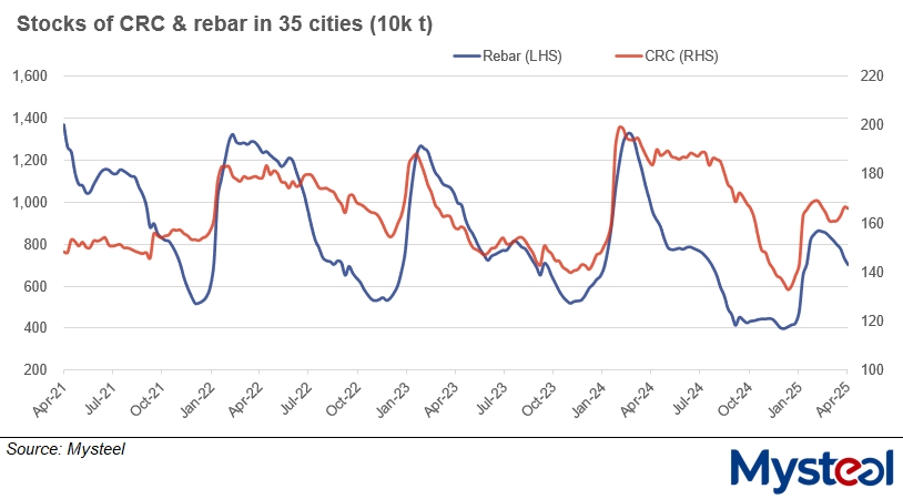 In fact, as of April 24, the total inventories of cold-rolled coils held by steelmakers and trading houses across the 35 cities under Mysteel's monitoring had increased by 3.2% on month to reach 1.66 million tonnes, while their rebar stocks stood at 7 million tonnes after sliding for eight weeks straight.