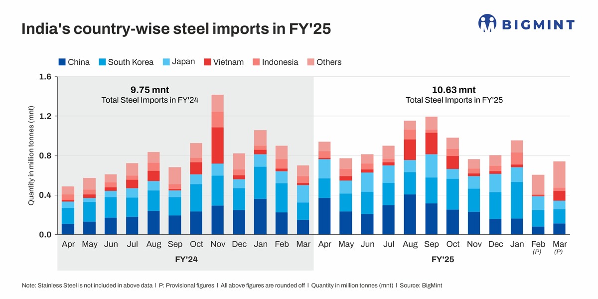 India's steel imports (including stainless steel) totalled 10.63 million tonnes (mnt) in FY'25, up 9% from 9.75 mnt in FY'24, according to provisional data with BigMint. This is the highest volume recorded in nine years.
