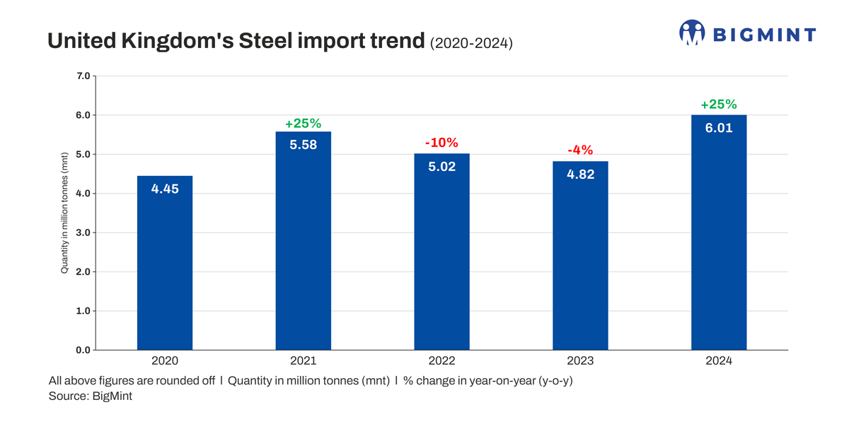 BigMint data show that steel imports into the UK increased by 25% y-o-y to over 6 mnt in CY'24. Imports of finished flats soared by 12% y-o-y to 3.45 mnt.