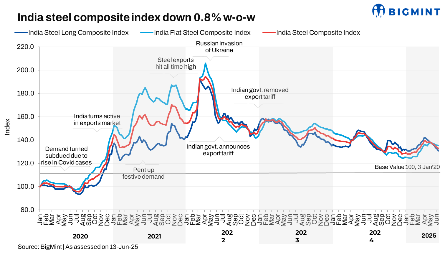 Morning Brief:The depression in the domestic steel market deepened towards mid-June 2025, with steel prices continuing their steady downward spiral. BigMints India steel composite index, a fixed reference point for the domestic steel market, dropped 0.8% w-o-w on 13 June, with long steel prices correcting more sharply than flats.