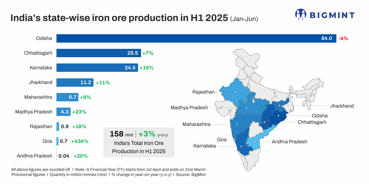 Morning Brief: Indias iron ore production increased by a slight 3% to 158 million tonnes (mnt) in H1CY'25 compared to 153 mnt in H1CY'24, according to provisional data maintained with BigMint.
