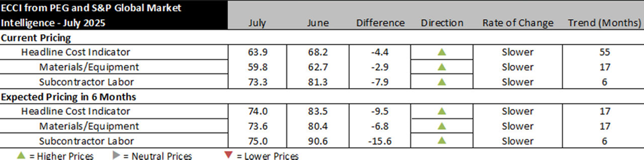 Engineering and construction costs continued to show gains in July, according to the Engineering and Construction Cost Indicator from PEG and S&P Global Market Intelligence. The headline Engineering and Construction Cost Indicator, a leading indicator measuring wage and material inflation for the engineering, procurement and construction sector, saw a net decline to 63.9 this month, but remains elevated. The sub-indicator for materials and equipment costs decreased by 2.9-points to 59.8 while the sub-indicator for subcontractor labor costs decreased to 73.3 in July from 81.3 in June.